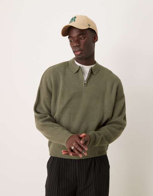ASOS DESIGN - Pull en maille oversize coupe carrée avec col polo zippé - Kaki
