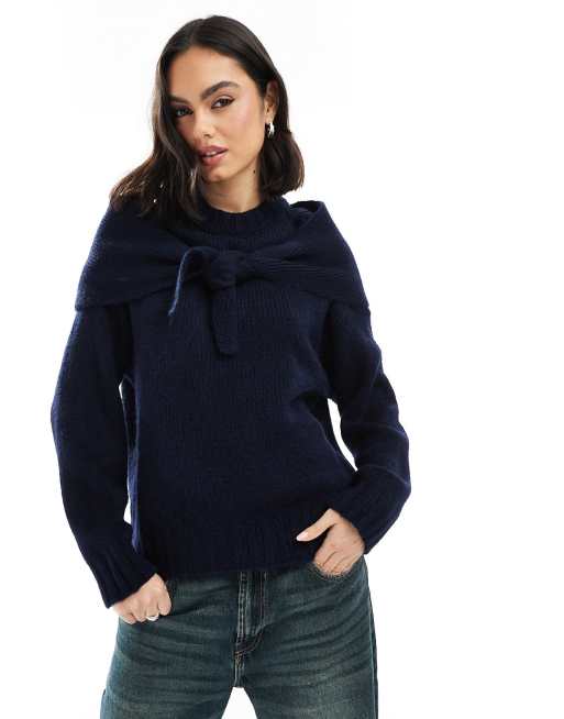 ASOS DESIGN - Pull ras de cou en maille avec foulard noué - Bleu marine