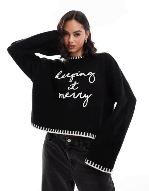 ASOS DESIGN - Pull ras de cou en point de feston avec inscription style Noël - Noir et blanc