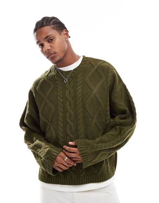 ASOS DESIGN - Pull ras de cou oversize en maille torsadée épaisse de laine mélangée - Kaki