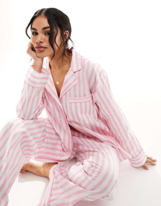 ASOS DESIGN - Pyjama avec chemise manches longues et pantalon en tissu tissé à rayures - Rose