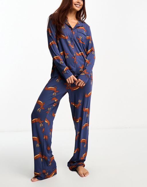 ASOS DESIGN - Pyjama de Noël ultra doux à imprimé teckel avec pantalon et chemise à manches longues et liserés - Bleu marine