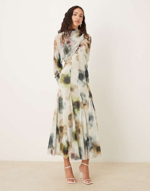 ASOS DESIGN - Robe à manches longues et dos ouvert avec partie supérieure croisée jupe évasée à godets et imprimé fleurs aquarelle flouté