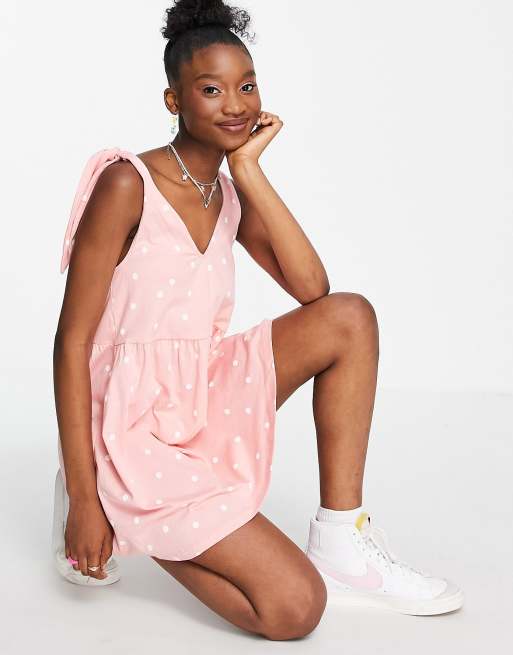 ASOS DESIGN - Robe babydoll courte nouée aux épaules - Rose à pois blancs