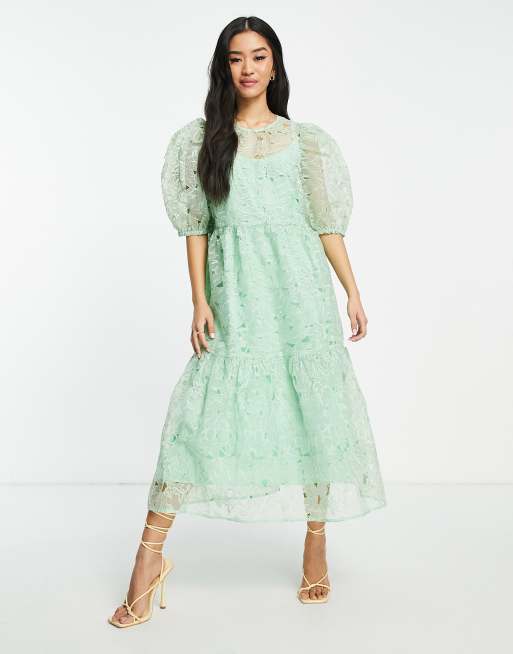 ASOS DESIGN - Robe babydoll mi-longue à volants en organza à motif ajouré fleuri - Vert pastel