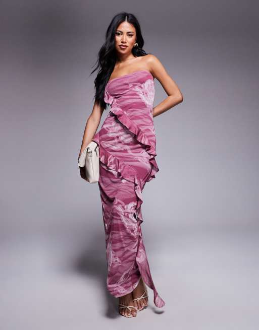 ASOS DESIGN - Robe bandeau mi-longue à fleurs avec volants - Blush