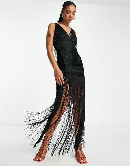 ASOS DESIGN - Robe cache-cœur longue drapée à franges - Noir