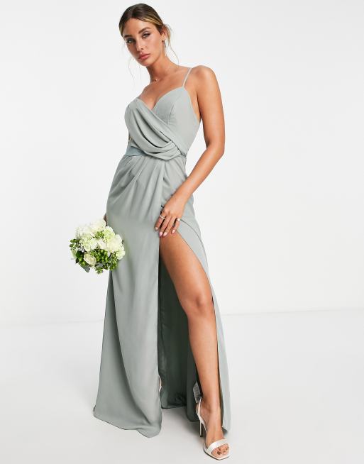 ASOS DESIGN - Robe caraco longue drapée de demoiselle d'honneur avec jupe portefeuille - Olive