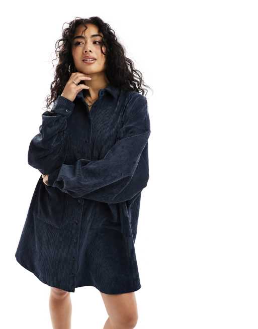 ASOS DESIGN - Robe chemise oversize en velours côtelé avec poches basses - Bleu