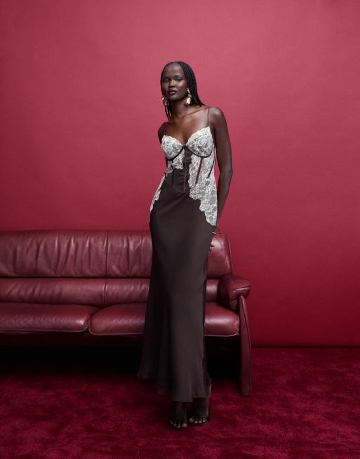 ASOS DESIGN - Robe corset longue et structurée à détails en dentelle - Chocolat