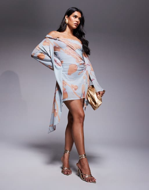ASOS DESIGN - Robe courte à encolure Bardot, manches anges et finition nouée - Bleu fleuri