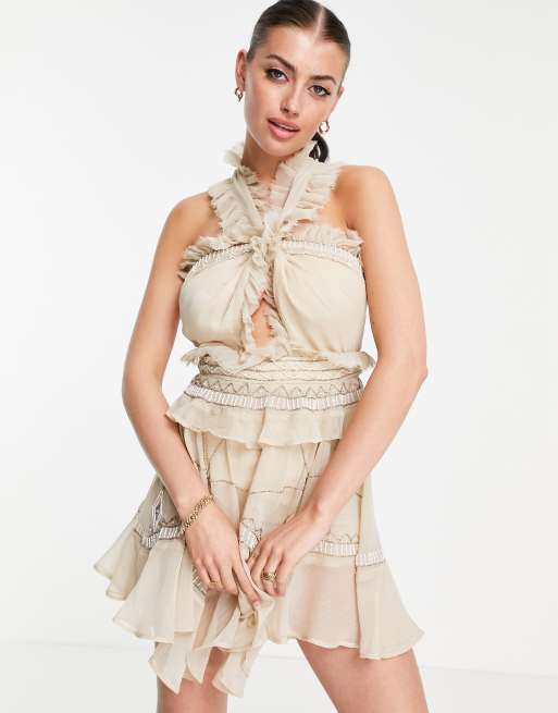 ASOS DESIGN - Robe courte dos nu ornementée avec volants et bords effilochés
