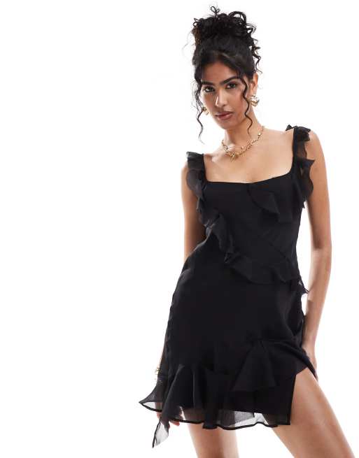 ASOS DESIGN - Robe courte effilochée nouée dans le dos à volants - Noir