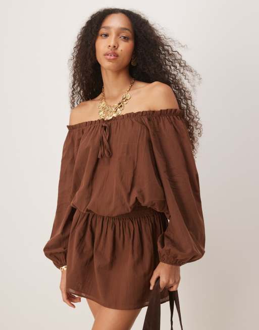ASOS DESIGN - Robe courte en coton style bohème avec encolure bardot - Chocolat