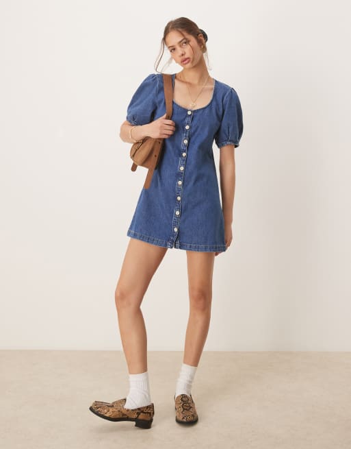 ASOS DESIGN - Robe courte en jean à boutonnage et manches bouffantes - Bleu moyen délavé