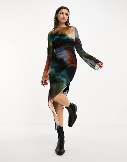 ASOS DESIGN - Robe courte en mousseline à encolure bateau avec ourlet tombant asymétrique - Bleu imprimé marbré