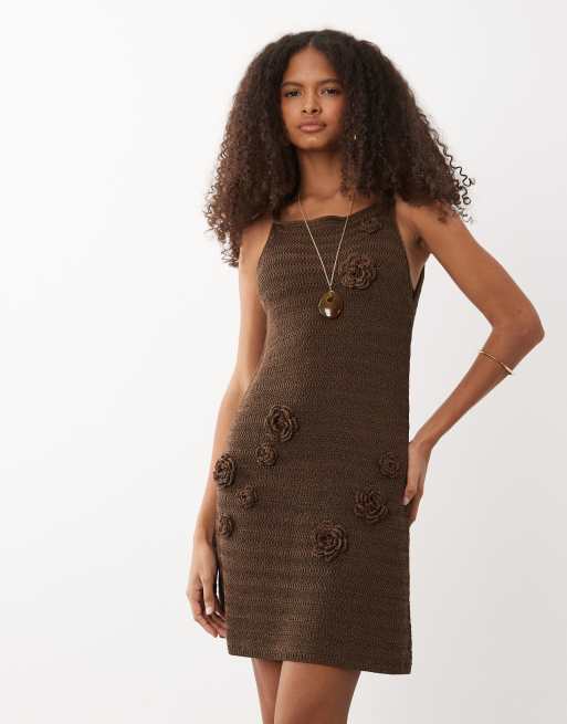 ASOS DESIGN - Robe courte en raphia avec fleurs au crochet en relief - Chocolat
