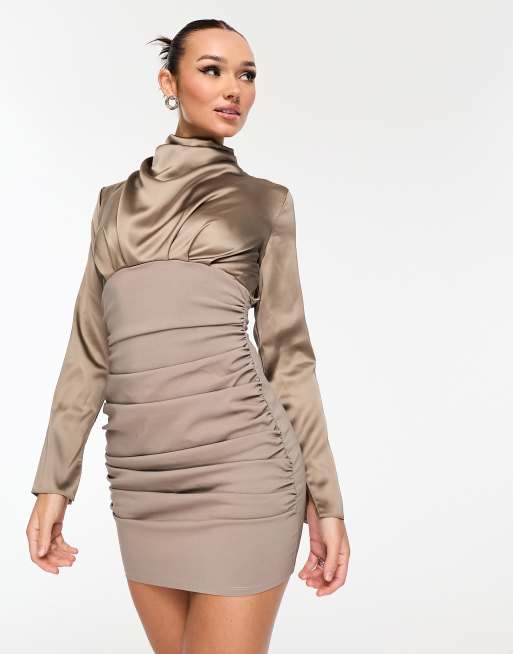 ASOS DESIGN - Robe courte en satin à col montant et jupe structurée - Champagne