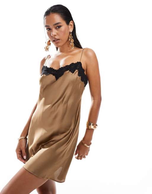 ASOS DESIGN - Robe courte en satin à fines bretelles et détail en dentelle - Marron