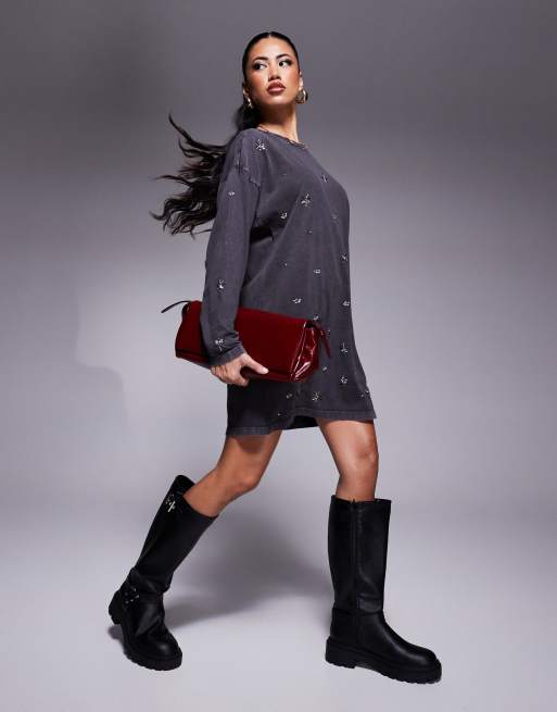 ASOS DESIGN - Robe courte ornementée à manches longues - Gris délavé
