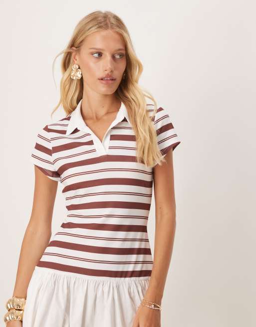 ASOS DESIGN - Robe courte rayée à manches courtes, col polo et jupe en popeline - Blanc et bordeaux