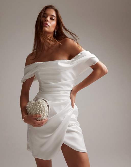 ASOS DESIGN - Robe de mariée courte en satin à épaules dénudées - Ivoire