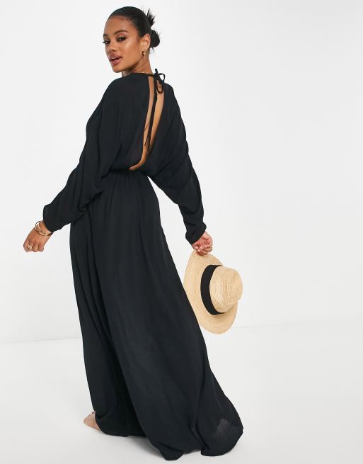 ASOS DESIGN - Robe de plage longue en tissu froncé effet froissé avec manches longues et décolleté - Noir