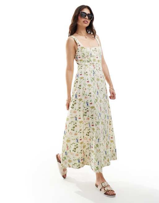 ASOS DESIGN - Robe d'été longue style tennis à surpiqûres et imprimé végétal - Crème