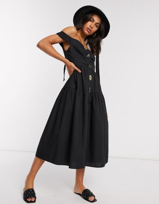 ASOS DESIGN - Robe d'été mi-longue en popeline de coton à épaules dénudées avec boutons variés - Noir
