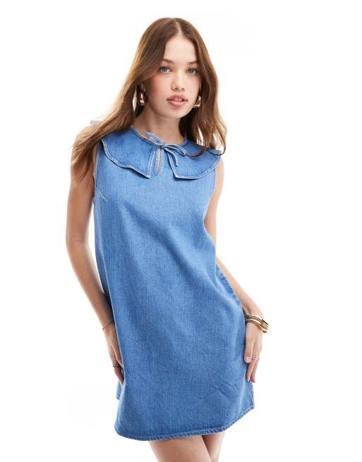 ASOS DESIGN - Robe en denim à large col - Bleu moyen