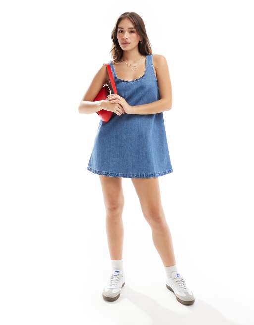 ASOS DESIGN - Robe en jean à encolure dégagée - Bleu moyen délavé