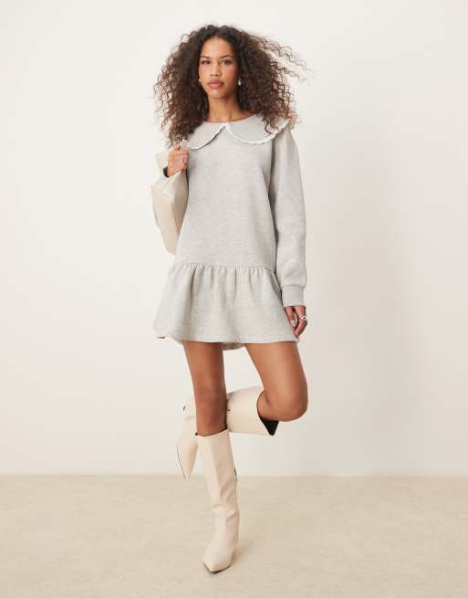 ASOS DESIGN - Robe en molleton à taille basse et col oversize avec dentelle - Gris