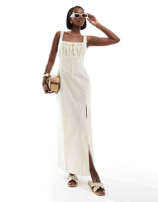 ASOS DESIGN - Robe fourreau mi-longue en lin avec buste froncée et ruban - Naturel