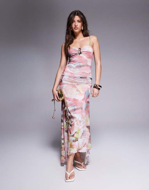 ASOS DESIGN - Robe longue à bretelles froncée devant en tulle à imprimé fleurs