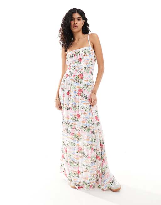ASOS DESIGN - Robe longue à corsage froncé avec encolure carrée et bretelles fines - Imprimé hawaïen