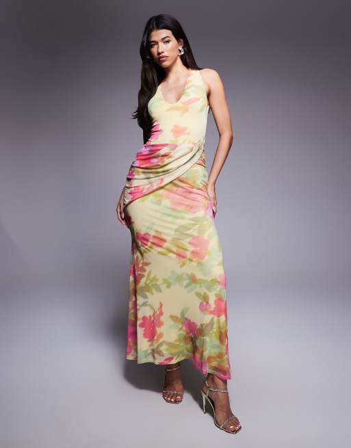 ASOS DESIGN - Robe longue à encolure plongeante en tulle avec ceinture enveloppante - Beurre à imprimé fleurs