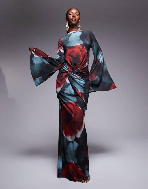 ASOS DESIGN - Robe longue à manches longues et larges et col montant avec imprimé abstrait - Rouge et bleu