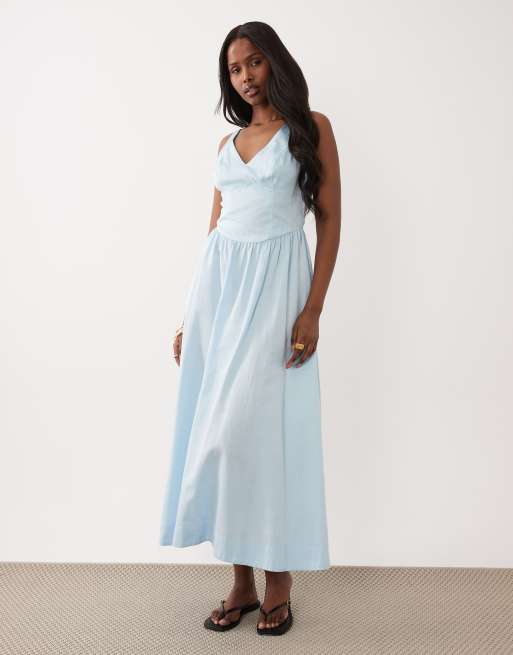 ASOS DESIGN - Robe longue à surpiqûres avec col V et taille cintrée - Bleu acier