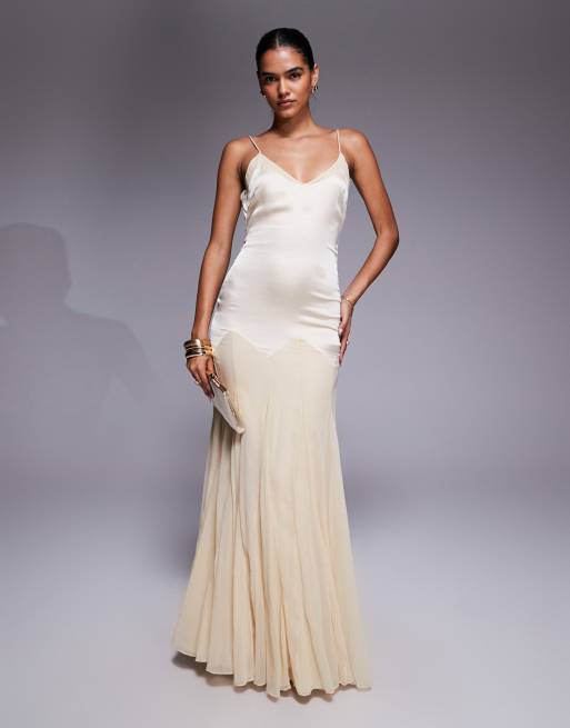 ASOS DESIGN - Robe longue à taille basse en satin et mousseline mélangés avec jupe ample à godets - Babeurre