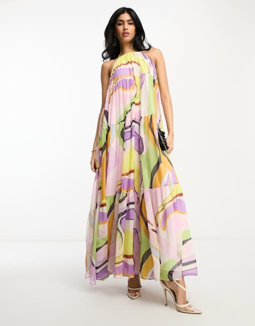 ASOS DESIGN - Robe longue à volants, coupe trapèze, dos nu et lien - Imprimé abstrait