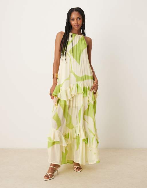 ASOS DESIGN - Robe longue à volants et dos nu - Vert abstrait