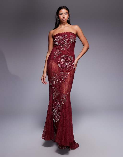 ASOS DESIGN - Robe longue bandeau en dentelle ornementée avec détail corset et ourlet sirène - Framboise