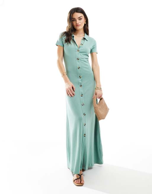 ASOS DESIGN - Robe longue boutonnée avec col en imitation lin - Vert