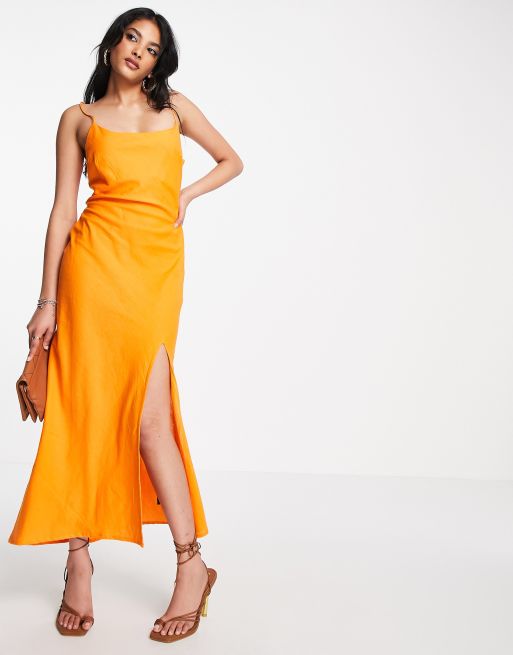 ASOS DESIGN - Robe longue d'été à fines bretelles en lin avec fente - Orange
