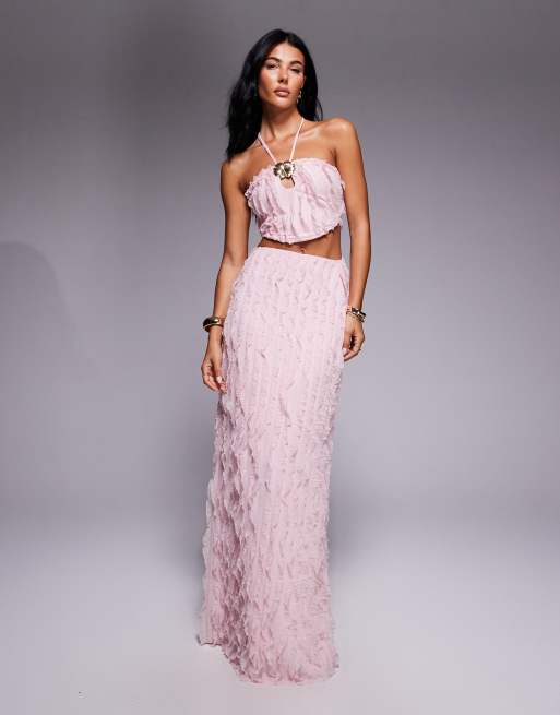 ASOS DESIGN - Robe longue dos nu en tissu texturé à détail fleur - Rose