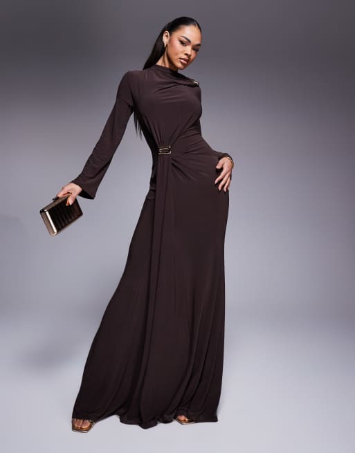 ASOS DESIGN - Robe longue drapée à manches longues de qualité supérieure avec double rebord - Chocolat