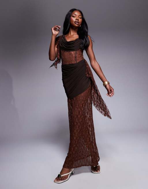 ASOS DESIGN - Robe longue drapée transparente à col bénitier avec fond de robe couvrant - Chocolat