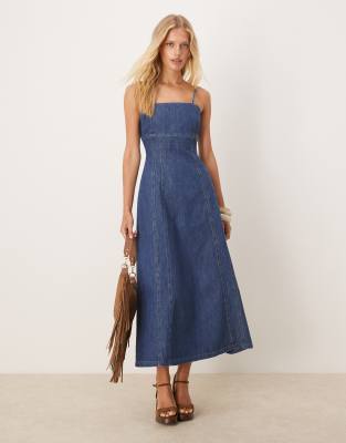 ASOS DESIGN - Robe longue en denim style chambra avec taille cintrée à surpiqûres - Bleu moyen