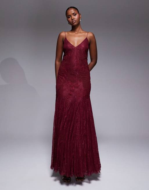 ASOS DESIGN - Robe longue en dentelle fleurie brodée avec ourlet à godets - Bordeaux
