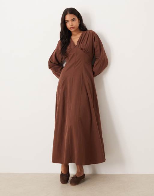 ASOS DESIGN - Robe longue en popeline à manches longues et col V - Chocolat